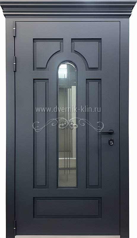 Металлофиленчатая входная термодверь с карнизом, ковкой, остеклением и порошковой покраской антрацит КД-1394