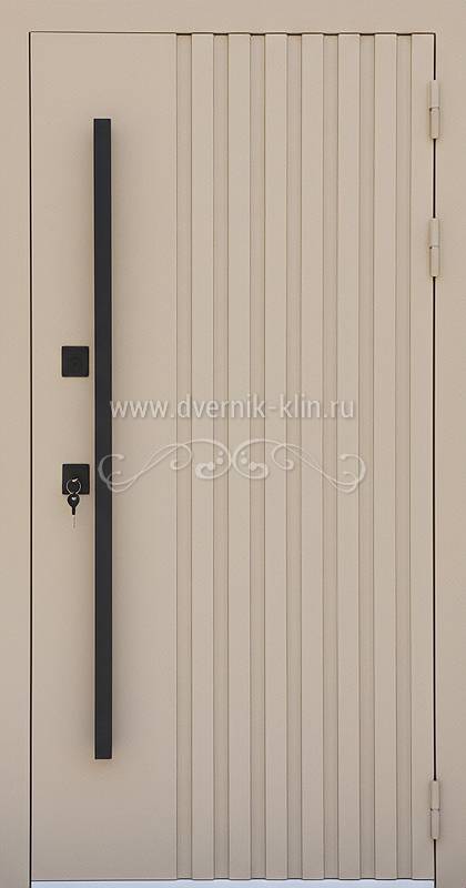 Входная дверь с металлорейками, длинной ручкой и порошковой покраской (RAL 1001) КД-1353
